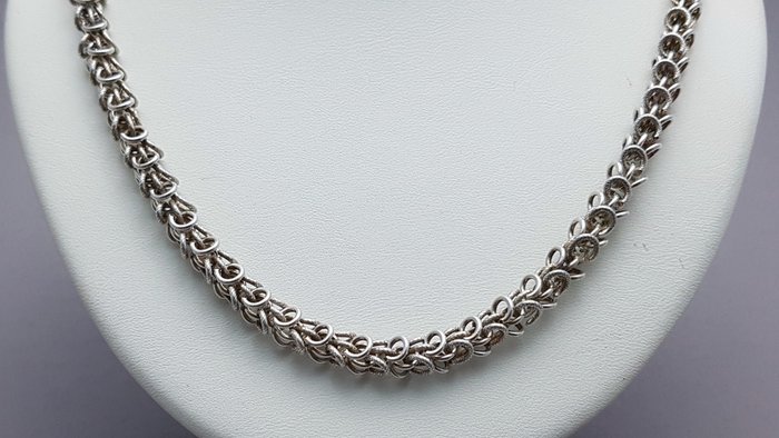 Fraaie zilveren Vintage halsketting van gevlochten losse schakels, bewerkt en onbewerkt.De schakels bewegen 'los' van elkaar dus de halsketting valt daardoor soepel om de hals.