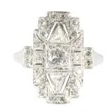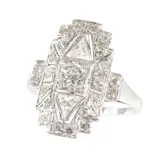 This vintage 1950s platinum ring, an exquisite piece from the Art Deco-inspired Fifties, celebrates the era's fascination with geometry. Its captivating design features an old brilliant cut diamond, complemented by triangular side stones and a constellation of single brilliant cut diamonds. The ring's geometric precision, a hallmark of the period, not only showcases craftsmanship but also symbolises the harmony and balance in enduring love. Its timeless design, while echoing the past, continues to resonate with contemporary aesthetics, making it a perfect emblem for both engagement and anniversaries.