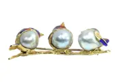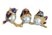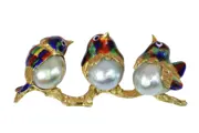A charming vintage 1960s brooch from Italy, designed as three enamelled birds perched closely together on a textured gold branch. Each bird is formed with a baroque pearl body and finished with vivid polychrome enamel in rich, shimmering tones. The playful composition and lively colour contrast give this sixties jewel a light-hearted character, while the natural irregularity of the pearls adds warmth and individuality to the piece.