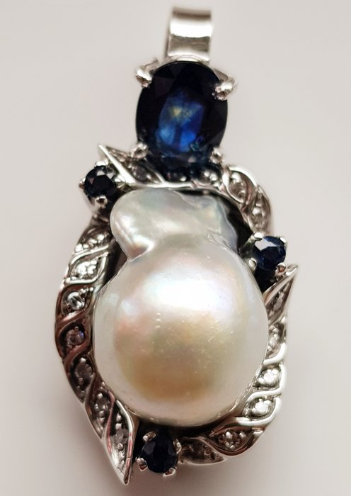 Prachtige hanger in 18K witgoud (getest) met een grote semi-barokke parel 15.07mm x 11.25mm, 4 natuurlijke saffieren 1= 8mm x 6mm 3=3mm en 18 diamanten=1mm briljant geslepen.