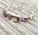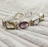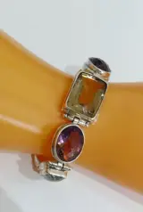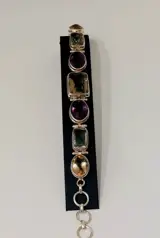 Prachtige zware handgemaakte zilveren armband ingelegd met amethist, citrien, aquamarijn en rookkwarts. De totale lengte van de armband meet 23 cm maar deze is verstelbaar tot 20 cm.