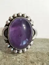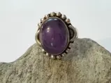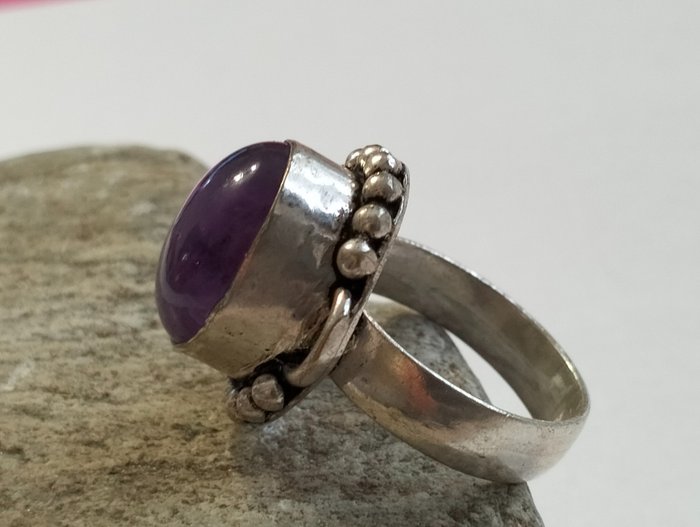 Vintage 925 zilveren ring met amethist cabochon. Mooie handgemaakte zilveren ring, hoog gemonteerd met een natuurlijke amethist cabochon ca. 20 ct. Afmetingen: ringkop 20/22 mm, hoog gemonteerd 13 mm, amethist edelsteen 18/12 mm. Gemerkt.