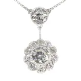 Crafted around 1950, this platinum pendant captures the elegance of mid-century design with a nod to Art Deco symmetry. A central old European cut diamond of approx. 1.50ct is framed by a scalloped cluster of antique stones, suspended beneath a second diamond in clean bezel setting. The structure is precise yet refined, allowing the diamonds to command attention without excess. Understated, timeless, and quietly luxurious.