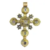 An exquisite example of Georgian craftsmanship, this circa 1700 pendant exudes a refined elegance. Celebrating Christian symbolism, its cross form is meticulously adorned with six table cut rose diamonds and four senailles, harmoniously set in 18K yellow gold with silver details. The design, influenced by the opulent Georgian era, reflects the artistic sensibilities of the period, mirroring the rich history of the first four British monarchs of the House of Hanover. This pendant, a testament to its time, is a captivating piece for collectors and connoisseurs of antique jewellery.