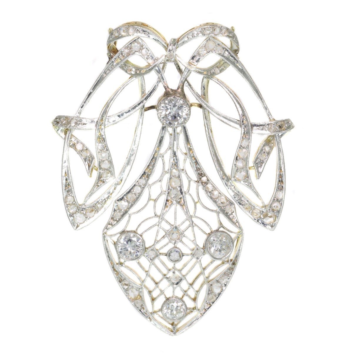 This splendid Art Nouveau pendant, doubling as a brooch, epitomises the turn of the 20th century elegance. Hailing from around 1900, possibly of Belgian origin, it showcases the era's quintessential curvilinear and floral motifs. Crafted in a harmonious blend of platinum and 18K yellow gold, it is adorned with four old European cut diamonds, totalling approximately 1.00ct, alongside 64 rose cut diamonds and senailles, radiating timeless charm. A testament to the era where art became part of everyday life, this piece perfectly captures the spirit of Art Nouveau.