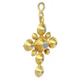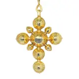 This magnificent 18th-century cross pendant, with its origins likely in France or Belgium, is a splendid example of Rococo artistry. Fashioned from 18K yellow gold, it dates back to around 1750, a time when Rococo style flourished with its ornate and playful designs. The pendant is adorned with ten rose cut diamonds and senailles, set on foil to enhance their luster—a technique characteristic of the era. The cross symbolizes both divinity and the earthly realm, reflecting its Christian inspiration. This piece is not only a religious icon but also a testament to the intricate craftsmanship of the Rococo period.