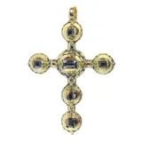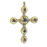 A splendid example of Baroque artistry, this circa 1700 pendant exudes the era's characteristic dynamism and rich ornamentation. Originating from Belgium, its design is infused with the profound influence of Christianity, encapsulated in its central theme of the cross. Crafted in 14K yellow gold, the pendant features six table cut rose diamonds, set upon foil to enhance their brilliance—a testament to the ingenious techniques of the period. Its harmonious symmetry contrasts the later Rococo asymmetry, reflecting a deep reverence for classical forms and the intricate balance of the divine and the worldly.
