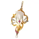A marvel of Art Nouveau from circa 1900 France, this pendant exudes organic elegance. Its design, inspired by nature, features flowing lines and floral motifs, characteristic of the era. The piece is beautifully crafted in two-tone 18K gold, adorned with 23 senaille diamonds and five rubies. A standout feature is the large, baroque Mississippi dog tooth pearl, adding a unique, organic touch. This pendant, blending artistic craftsmanship with natural forms, is a quintessential example of Art Nouveau's fusion of art and everyday life.