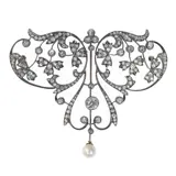 A Victorian combined brooch-pendant from the Romantic Period, circa 1850, exudes sentimental charm with its 181 diamonds set in silver and backed by 14K yellow gold. The piece, very good in condition, features one prominent old brilliant cut diamond of around 1.00 carat, surrounded by 15 old mine cuts and numerous rose cuts totalling approximately 2.50 carats. The brooch-pendant, not ostentatious yet deeply symbolic, carries a single natural pearl, underscoring the Victorian affinity for nature and nuanced craftsmanship that required less precious metal yet achieved a look of quiet opulence.