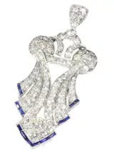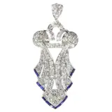 A pendant exuding the elegance of the Art Deco era, circa 1920, likely of Belgian provenance. In good condition, it showcases the period's signature geometric forms and abstract motifs, encapsulating the time's zest for modernism and luxury. Crafted from platinum, it is adorned with 98 old European and single brilliant cut diamonds, totalling approximately 5.57 carats of H/J, vs/i quality, their integrity preserved by meticulous setting. Complementing the sparkle, 14 lab-produced baguette cut sapphires reflect the era's appreciation for beauty over material value. A piece where history's whisper meets the glamour of the Roaring Twenties.