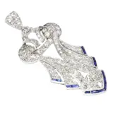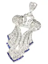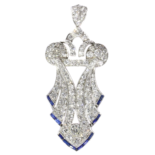 A pendant exuding the elegance of the Art Deco era, circa 1920, likely of Belgian provenance. In good condition, it showcases the period's signature geometric forms and abstract motifs, encapsulating the time's zest for modernism and luxury. Crafted from platinum, it is adorned with 98 old European and single brilliant cut diamonds, totalling approximately 5.57 carats of H/J, vs/i quality, their integrity preserved by meticulous setting. Complementing the sparkle, 14 lab-produced baguette cut sapphires reflect the era's appreciation for beauty over material value. A piece where history's whisper meets the glamour of the Roaring Twenties.