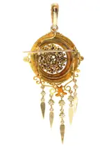 This captivating combined brooch-pendant, dating back to the Romantic Victorian Period around 1860, is a remarkable example of Victorian artistry. Crafted in 18K yellow gold, this versatile piece features nine rose cut diamonds and 18 half seed pearls, embodying the era's love for intricate design and sentimental motifs. The enamelling technique used enhances the jewel's allure, showcasing a craftsmanship that celebrates both beauty and innovation. This piece, adaptable as both a brooch and a pendant, offers a glimpse into the rich history and romantic essence of the Victorian era, making it not only a stunning accessory but also a wearable piece of history.