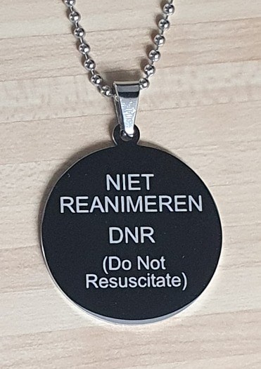 Zilverkleurige RVS penning niet reanimeren, zonder persoonsgegevens (geen rechtsgeldige wilsverklaring), voorzien van een sterke RVS bolletjesketting van 70 cm. Met deze penning met opschrift 'niet reanimeren', kunt u aangeven dat u niet gereanimeerd wenst te worden. Deze penningen zijn geen rechtsgeldige wilsverklaring, omdat de persoonsgegevens ontbreken op deze penning. Indien u die niet-reanimerenpenning met persoonsgegevens wilt, dan dient u het andere artikel te kiezen. Materiaal: Sterk roestvast edelstaal. Haarscherp gegraveerd en ook voorzien van de internationale DNR-aanduiding (Do Not Resuscitate)