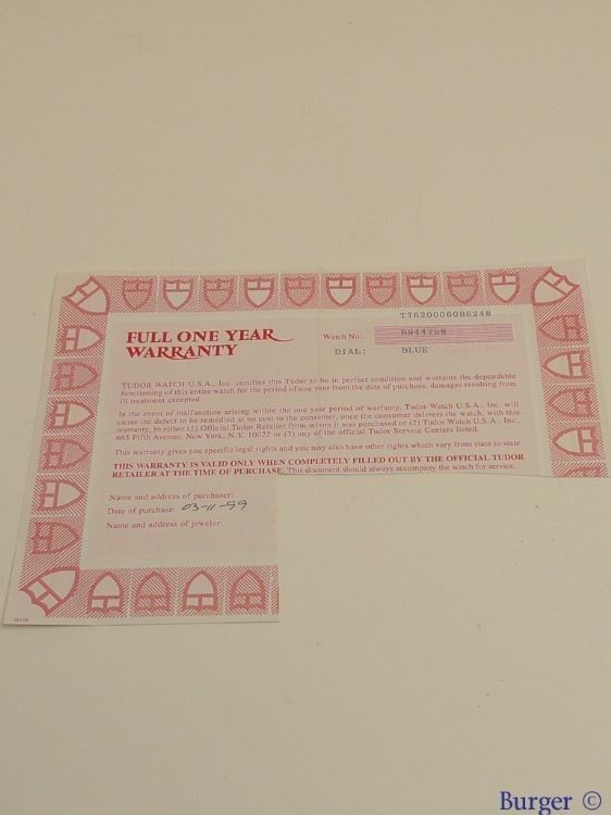 Tudor Warranty Certificate Ref: 76200