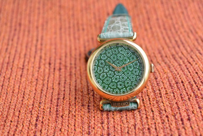 Te koop Altanus Murano horloge, patent aangevraagd, horlogenummer 134, 20 micron goud gelamineerde kast, diameter 32 mm, handbeschilderde Murano glazen wijzerplaat, goud gelamineerde kastbodem met patrijspoort voor het bekijken van het uurwerk, genummerd 134, alles gebeiteld, Swiss made AS 2800 -2 Altanus-Murano krokodillenband bandlengte 23 cm inclusief horloge nieuw horloge ongedragen horloge verzonden via Poste Italiane