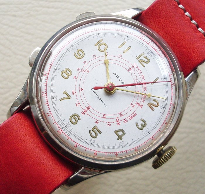 Handmatig opwindbaar uurwerk, dubbele knop en kroon: dit horloge werd gebruikt voor "spot" metingen, waarschijnlijk voor sportevenementen of om twee horloges te synchroniseren en de meting te starten.