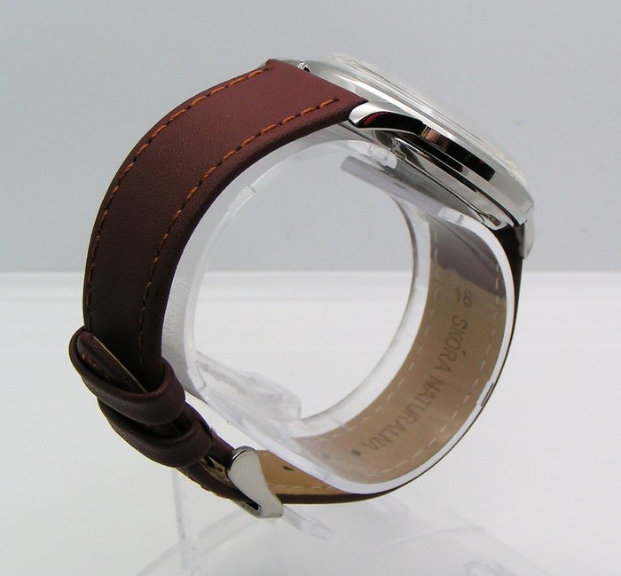 Het horloge heeft een bruine leren band (lengte 240 mm).