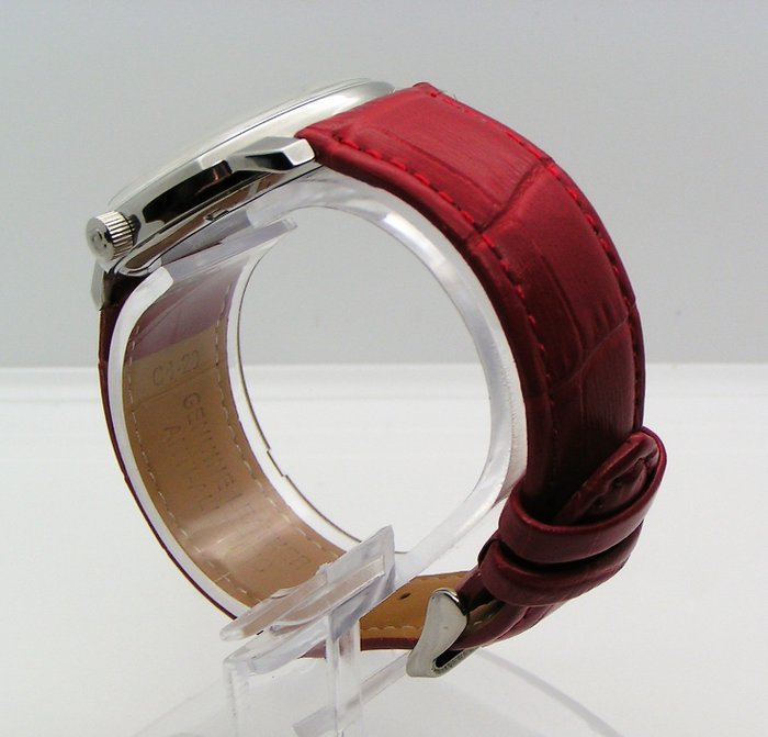 Het horloge heeft een bruine leren band (lengte 240 mm).