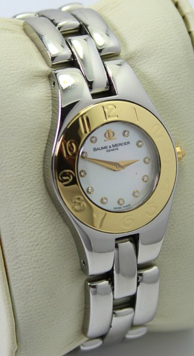 Prachtig luxe Baume & Mercier diamanten horloge in uitstekende staat met een mooie parelmoeren wijzerplaat met diamanten markeringen en 18kt gouden lunette met Baume & Mercier roestvrijstalen band