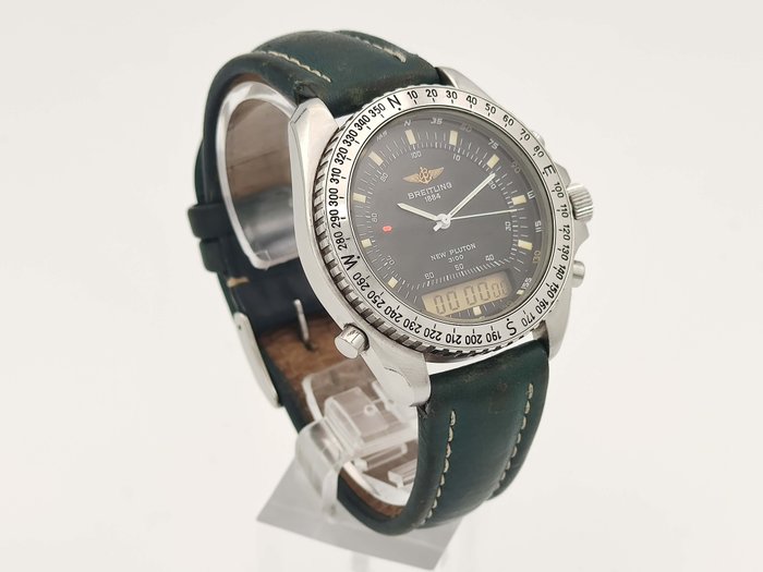Breitling New Pluton horloge, roestvrij staal met originele Breitling leren band, verkocht door gecertificeerde juwelier.