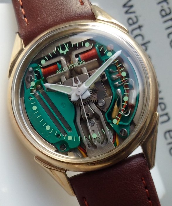 het koepelvormige kristal heeft Accutron-markeringen en -logo.