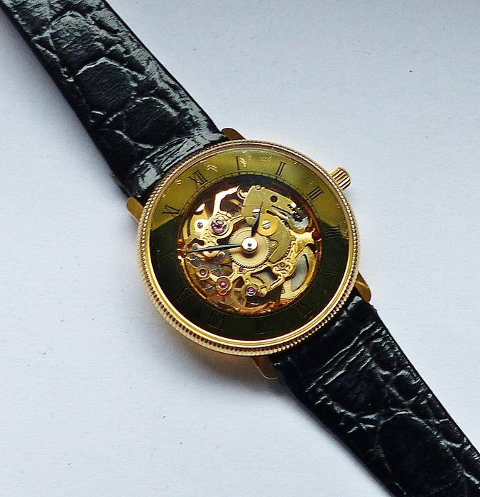 Prachtig Bulova Skeleton Classic damespolshorloge met gouden wijzerplaat en zwarte Romeinse cijferindexen, zichtbaar mechanisch uurwerk. Het horloge is volledig functioneel en in topstaat, zie foto's
