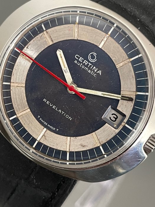 De binnenkant van de achterkant van de kast is gesigneerd met Certina Watch Corp SWISS roestvrij staal.