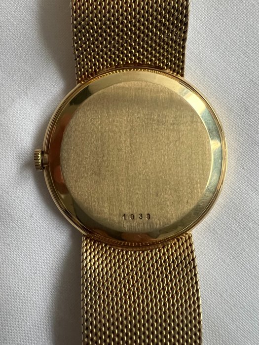 Er zijn twee maatinstellingen, passend tot een maximum van 18,5 cm of 7,28 inch. Kast en armband is massief 18k goud met een totaal gewicht van 76 gram. Zonder uurwerk en glas is het totale gewicht van het goud 64 gram. Diameter kast is 32cm zonder kroon en 33mm inclusief kroon.