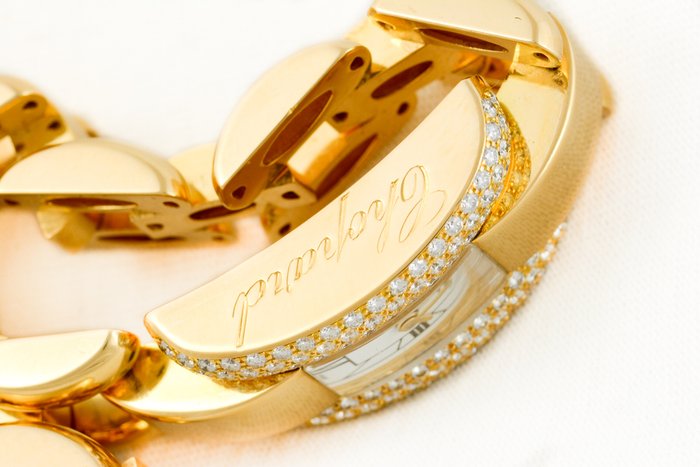 origineel geel goud 18k, diamant op lunette, schroef, gegraveerde zijkant met Chopard-logo, plak op achterkant kast, individueel nummer 497503