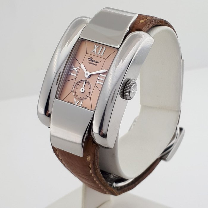 Kenmerken: Saffierkristalglas, roestvrij staal, kleine seconde (subseconde), Romeinse cijferindexen, zalmkleurige wijzerplaat, bruine Chopard lederen band, Chopard-gesp, Chopard-kroon