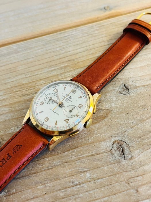 Prachtige mooie, grote en verwarde Britix Chronographe Suisse horloge in 18K rosé goud!! Het horloge loopt perfect op tijd met een hele goede gangreserve en zo werkt ook de chronofunctie, zet zich stipt terug op 0!!
