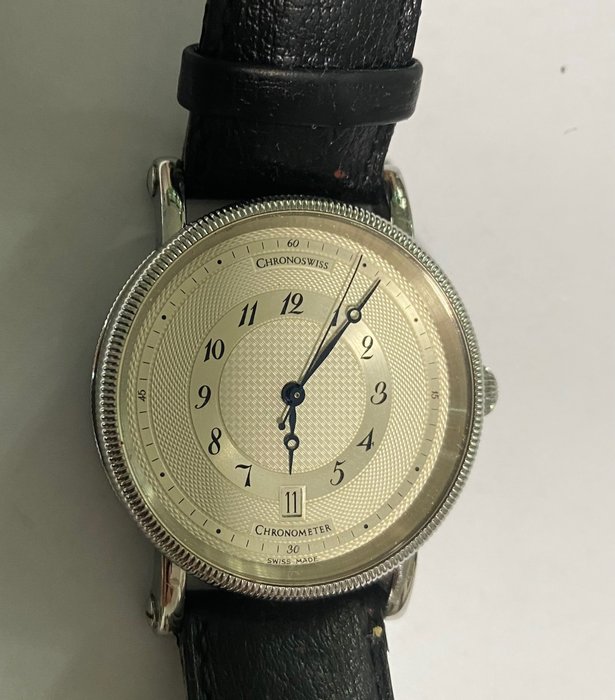 Roestvrij staal. Geschroefde saffieren achterkant. Ref 2823. Automatisch uurwerk kaliber 2892A2. Door de motor gedraaide zilveren wijzerplaat. Datum diafragma. Centrale seconden. Breguet stalen wijzers. Ingeschreven CHRONOMETER. Zwart lederen band met duidelijke gebruikssporen. Originele gesp.