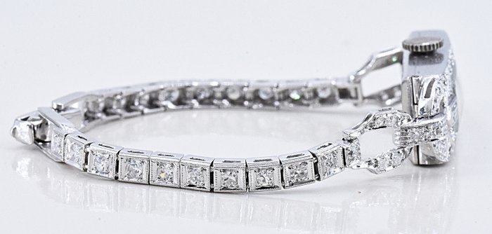 Clinton, exclusief horloge. platina met kwaliteitsdiamanten. Diamantcollectie, op een gouden kast, gouden armband. Blauwe wijzerplaat.