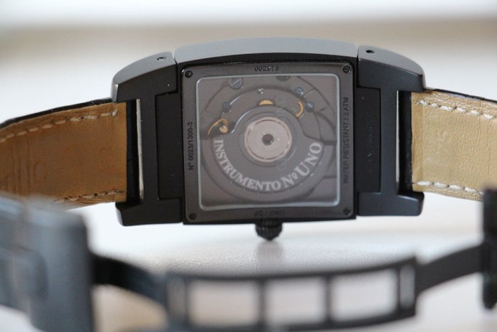 Horloge met 33 mm zwarte PVD roestvrijstalen kast, 10,8 mm dik, rechthoekige bezel. Horlogefuncties: meting van tijd in uren en minuten, tweede tijdzone en datum. De zilveren wijzerplaat, met twee centrale wijzers, laat ruimte voor een tweede tijdzone. De bezel en kast zijn beide gemaakt van zwart PVD roestvrij staal terwijl de band is gemaakt van krokodillenleer.