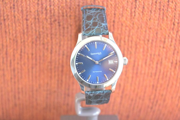 Te koop, Eberhard Aiglon horloge ref.41116, stalen kast diameter 37 mm, blauwe wijzerplaat met stalen cijfers op staven met tritium, stalen bollen met tritium, datumweergave op 3 uur, met ontvoerde klik van de datum, merkschroef kroon, volledig stalen achterkant van de kast gemerkt vast met 4 schroeven, zelfopwindend uurwerk op een ETA 2824-2 basis afgewerkt en aangepast door Eberhard, generieke blauwe echte krokodillenband, lengte 24 cm