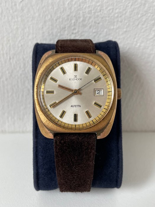 Prachtig horloge van het Zwitserse Edox. Vergulde kast met sunburst wijzerplaat, dagaanduiding en goudzwarte index.