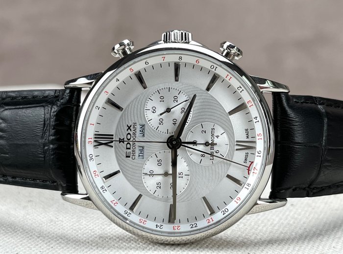 Een prachtig herenhorloge van Edox, uit Les Bemonts serie. Referentienummer 10501-3-AIN. Voorzien van een dag/datumaanduiding bij de 12 uur positie. Daarnaast is het horloge ook uitgerust met een datumpointer en chronograaf. Het horloge wordt aangedreven door een quartz uurwerk. De wijzerplaat is goed leesbaar door het contrast tussen de zilverkleurige wijzerplaat en de gekleurde accenten. van de achtergrond en de zilveren wijzers/indexen. Het glas is van saffier.