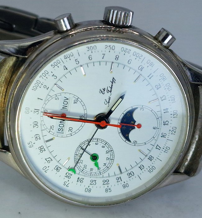 Originele wijzerplaat - wit geëmailleerd. Knuppels met lichtgevende punten. Lichtgevende wijzers. Grote datum met centrale lange wijzers met groene halve displayring. Dag links veld, maand rechts veld om 12 uur. Op 6 uur maanstand, op 12 uur urenteller - kleine seconden op 9 uur met 24 uurs teller aan de binnenkant met groene wijzers - 30 minuten teller onder de twaalf. Grote chronograafwijzers - rood. Ondertekend Eta Swiss Technology.