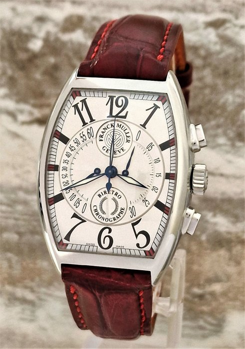 Een zeldzaam horloge uit 2018, aangeboden in de originele volledige set met de dozen van Franck Muller, certificaat van echtheid, documenthouder en op nieuwe kwaliteit JL rode krokodillenleren band met Franck Muller vouwgesp. Een tweede JL in donkerbruin wordt geleverd met een Franck Muller-gesp. Beide banden zijn op maat gemaakt in exact dezelfde kleuren als op de wijzerplaat.