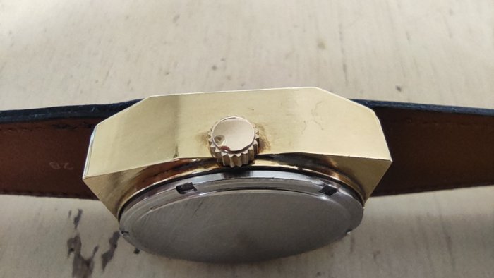 Horloge met vensters die typerend zijn voor de jaren zeventig in dezelfde geest als de Lip Bashmakoff. Uren en minuten in diafragma, secondewijzer, datum op 3 uur.