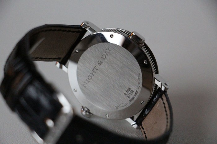 NACHT EN DAG. Ronde kast van 36 mm in gepolijst staal, bewerkt op de carrure. Automatisch mechanisch uurwerk. Witte wijzerplaat, lichtgevende aangebrachte indexen, dag/nacht-indicator op 12 uur, loepdatum op 6 uur, lichtgevende uren- en minutenwijzers, rode tweede tijdzonewijzer. Waterdichte kroon met stud-versiering, tweede tijdzoneknop op 9 uur Achterkant van geborsteld staal met nacht- en daggravure, vastgezet met schroeven. Saffierkristal. Zwarte glanzende krokodilriem en ardillon-gesp.