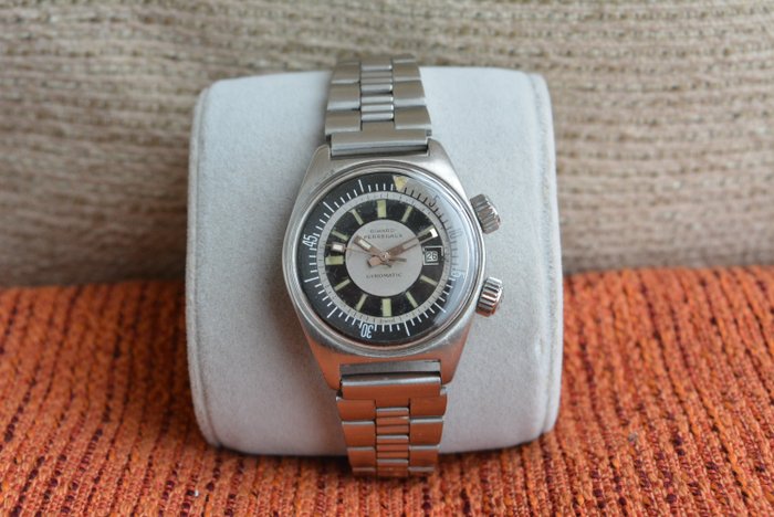FS: GIRARD PERREGAUX ” Gyromatic ” MINISUB – automatisch – 2 kronen Zeldzame GIRARD PERREGAUX ” GYROMATIC – MINISUB ”. Professionele duiker met een kleine diameter. Stalen kast met twee originele maxi kronen. Tweekleurige grijze en zwarte wijzerplaat, met bidirectionele roterende interne ring met schaalverdeling voor decompressietijden, draaibaar via de kroon op 2 uur,– Kastafmetingen: netto diameter van de kast 29 mm (exclusief kroon) 36 mm (van handvat tot handvat ) . De kast bevindt zich in uitzonderlijke opslagomstandigheden, stalen achterdeksel met drukpassing, alle merken, Mechanica: mechanisch met automatische opwinding Girard Perregaux-kaliber, onaangeroerd en perfect functioneel; Armband: in staal, ongemarkeerd, nieuw zoals het horloge (de armband met goede waarschijnlijkheid , in die tijd gebruikte GP soms GP-stempel op de doos, deze stempel had dan de neiging om te verdwijnen zoals ik toevallig zag bij andere horloges uit dezelfde tijd. Lengte van de armband: 20 cm inclusief horloge. Het horloge wordt verzonden via Poste Italiane .