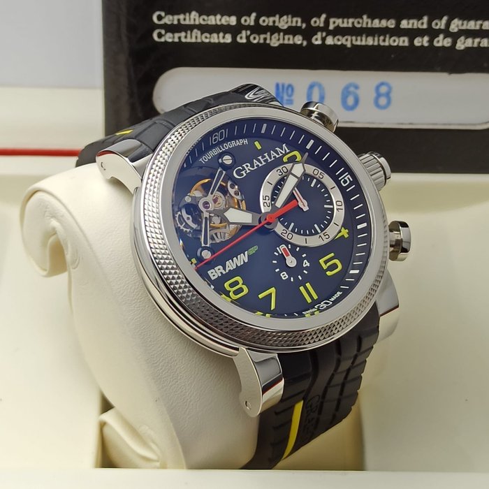 Wijzerplaatkleur: Zwart met geel oplichtende cijfers, opgedragen aan de officiële kleuren van het "BrawnGP" Formule 1-team.