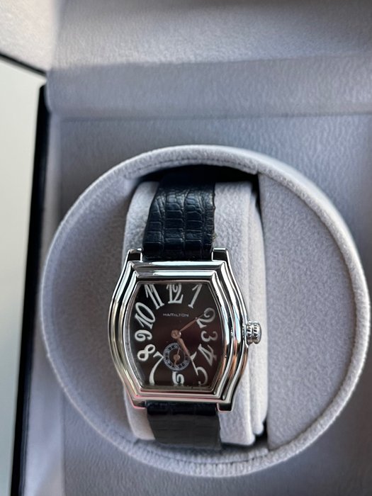stalen tonneau kast 32x37mm, zonder kroon, band 16mm, kastdikte 8mm. gewicht 43 gram, geschroefde achterdeksel, originele gekartelde en gemerkte kroon, getrapte bezel, zwarte analoge wijzerplaat met alleen tijdfunctie, Arabische cijfers en bediening, seconden op 6, Hamilton logo op 12.