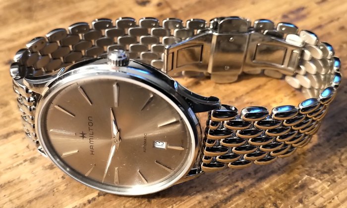 Een zeer elegante Hamilton met zijn goudbruine / iriserende wijzerplaat en zijn chroomstalen armband.