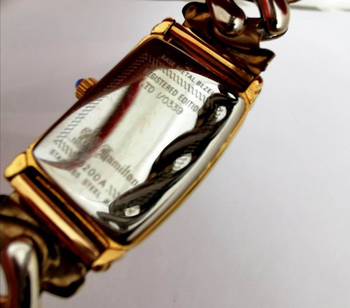 Moeilijk te vinden Hamilton dameshorloge met geregistreerde en gelimiteerde oplage (Made in USA), in perfect werkende staat, gelimiteerde vintage reproductie (jaren 20). Het kenmerk is de elastische "straps" armband (dia. 5,5 cm maar zeer rekbaar), staal en geelgouden plating zoals de kast (perfecte plating zonder vervaging). Geheel origineel in uitstekende staat.
