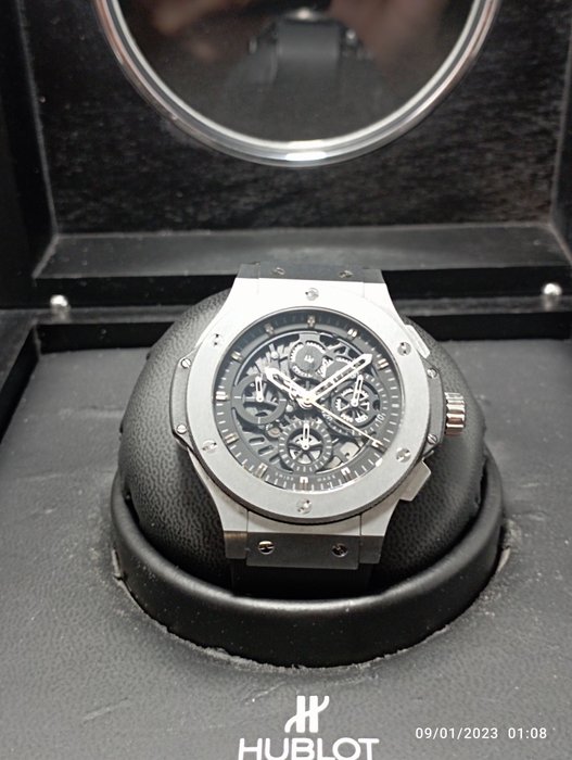 Hublot Tungsten Aero Big Bang 310.KX.1140.RX. Ltd Edition op 999. Automatisch Hublot HUB44 SQ-uurwerk. Kastdiameter 44 mm. Waterbestendig tot 100 meter. Kast gemaakt van Tungsten, gesatineerd. Zwarte microblasted skeleton wijzerplaat met toegepaste indexuurmarkeringen. Uren, Minuten, Kleine Seconden, Chronograaf, Datum tussen 4 en 5 uur. 27 juwelen, 252 onderdelen, 42 uur gangreserve. Zie door saffierglas terug. Zwarte siliconen rubberen band met vouwsluiting. Doos en papieren 2012.