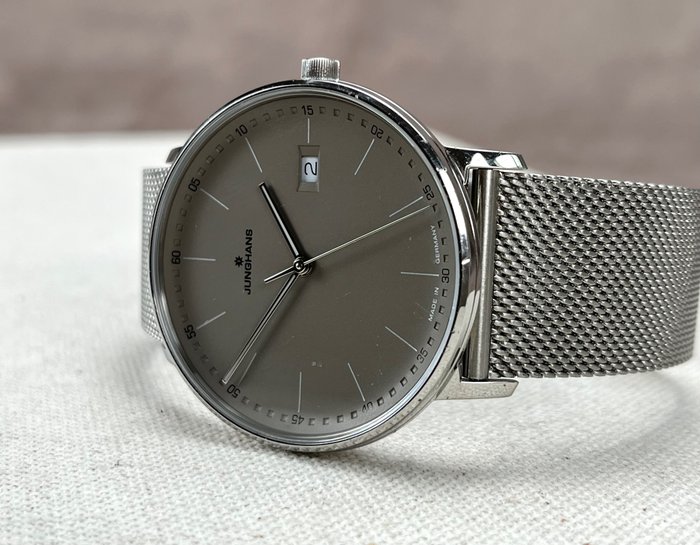 Het horloge ligt op een comfortabele stalen mesh horlogeband met de bijbehorende Junghans sluiting.