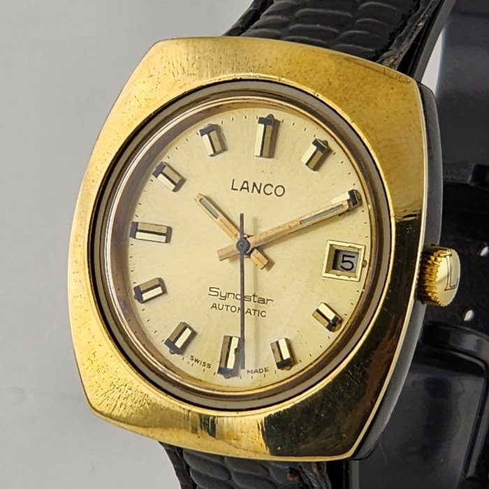 Dit horloge maakt gebruik van de bewegingsbasis komt van Omega. LANCO, Tissot en Omega zaten in de jaren zeventig onder dezelfde paraplu. LANCO Swiss Automatische datum. Koolstofvezel horloge groot maar toch licht 18k verguld LANCO herenpolshorloge in nette staat.
