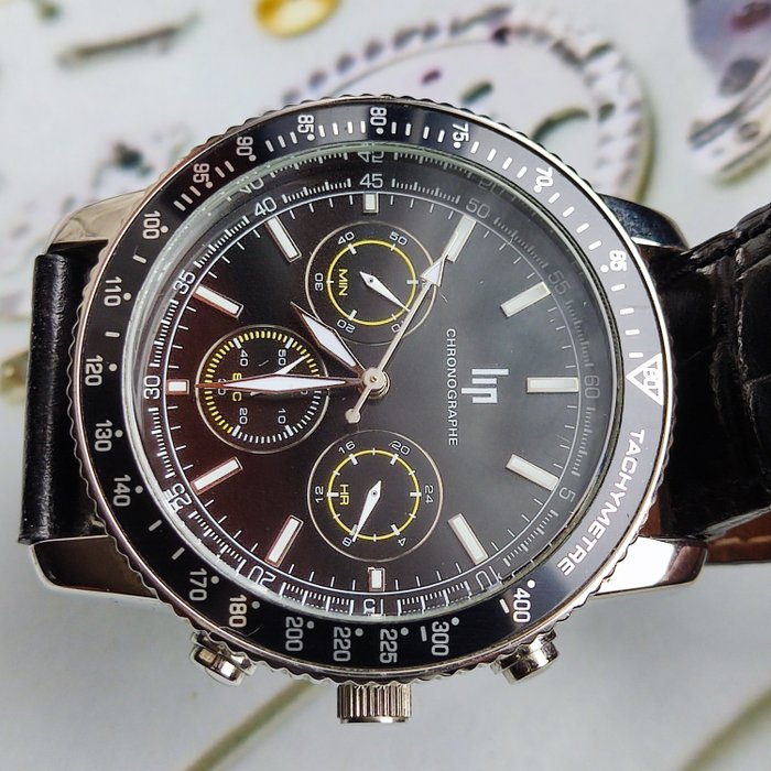Zwart gestikte krokodillenleren band, veilige vouwsluiting gesigneerd "LIP" polsomtrek tot 210 mm, verstelbaar met de gesp.